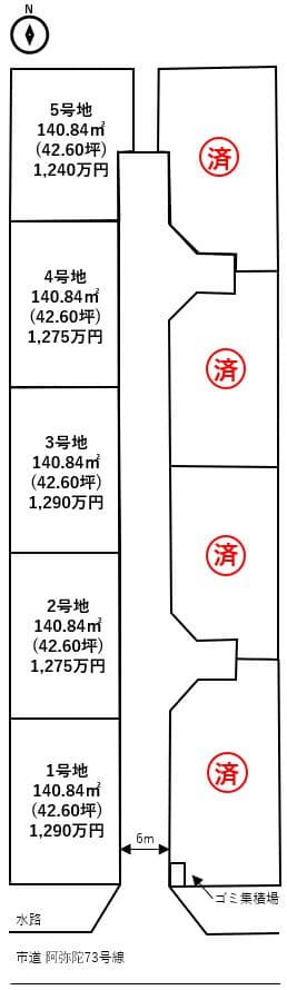 | 備考 | 42.6坪あります 5区画分譲(本物件5号地) お好きなハウスメーカーで建てていただけます! |